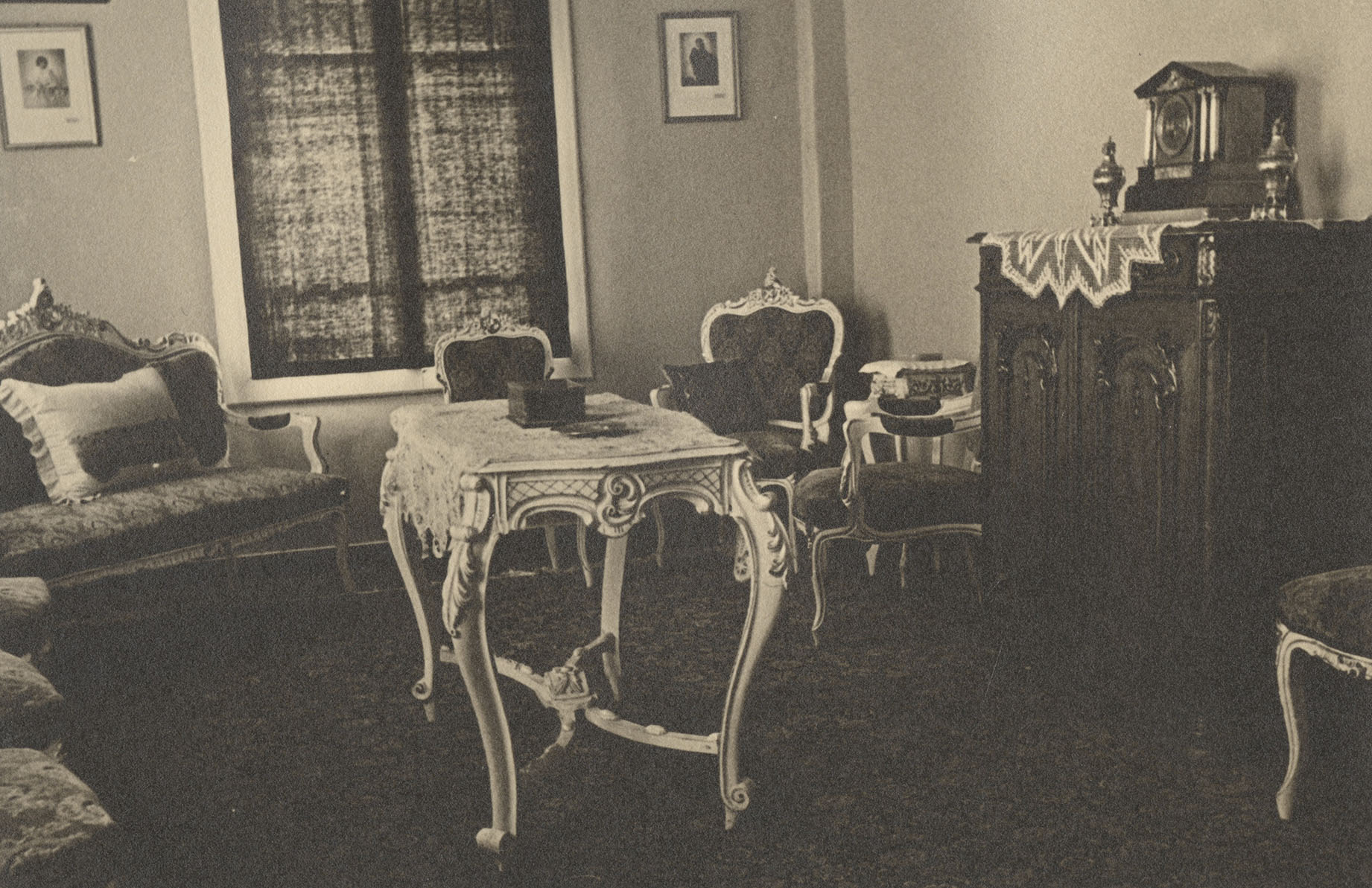 YUKARI KAT- İLK ODA: Girişin üzerinde olduğu için iyi ısınmayan bu oda önceleri oturma odası veya misafir odası olarak kullanılırdı. Bir dönem Erdal İnönü’nün gençliğinde onun misafirleri ile oturduğu bir oda olmuştu. Eşya olarak da Mevhibe Hanım’ın çeyizinden gelen beyaz lake takımlar buraya konmuştu. Daha sonra misafirler için yatak odası haline geldi. En çok da İsmet Paşa’nın kardeşi Rıza Temelli ve eşi kalırdı. Özden Toker ile Metin Toker Pembe Köşk’te oturmaya başlayınca onların yatak odası olarak kullanıldı. Fotoğraflarda bu odaların görüntüsü İnönü Vakfı arşivinde bulunan 1930’lu yıllarda çekilmiş bir albümden alınmıştır.